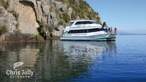 CHRIS JOLLY: Sit back and enjoy a Chris Jolly Outdoor Private Charter taking in spectacular views of Lake Taupo and the majestic mountains of the Tongariro National Park + cruise to the famous rock carvings.